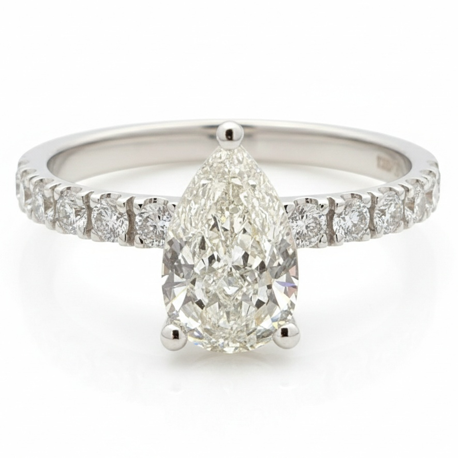 A stylish and elegant ring made of white gold , featuring a pear-cut central diamond.