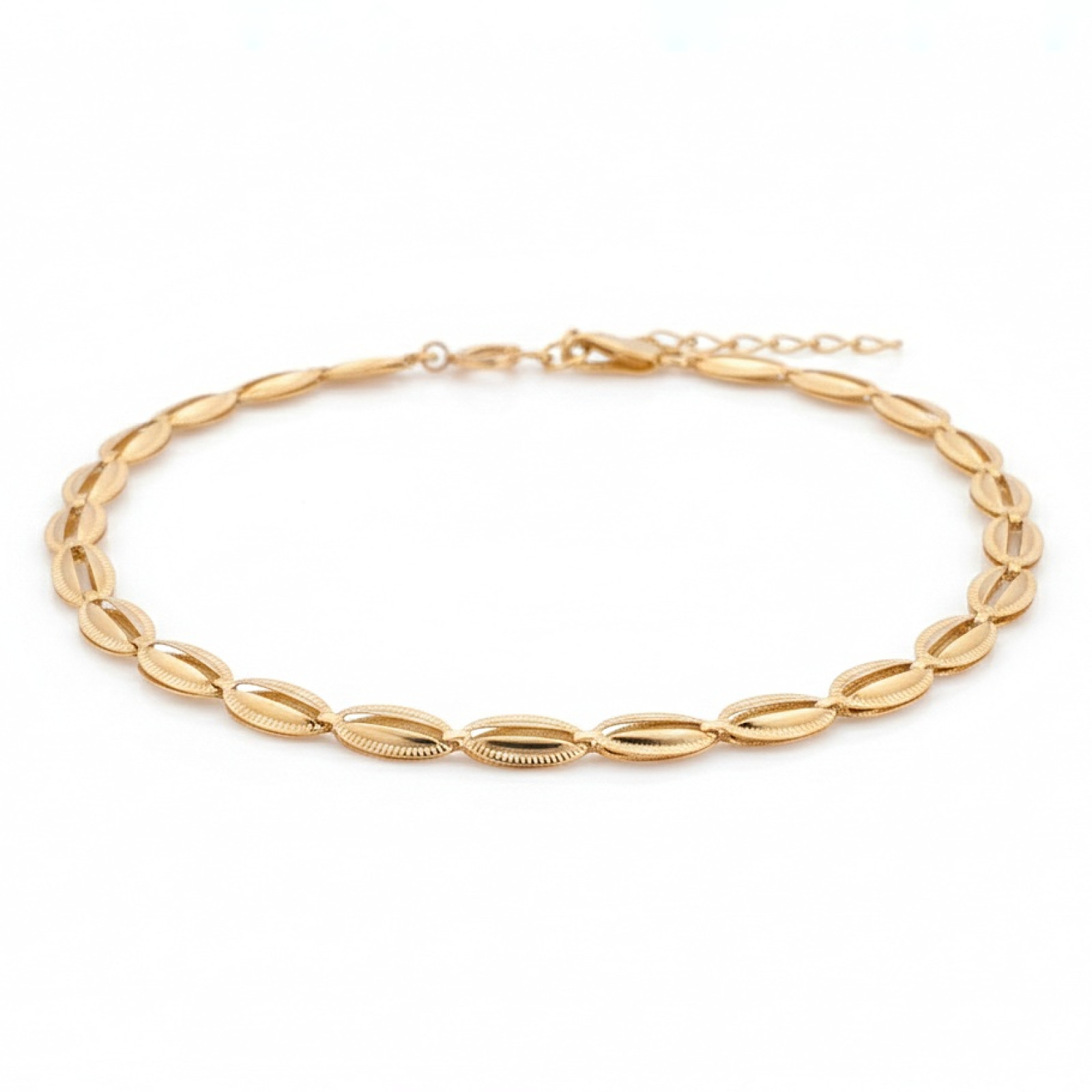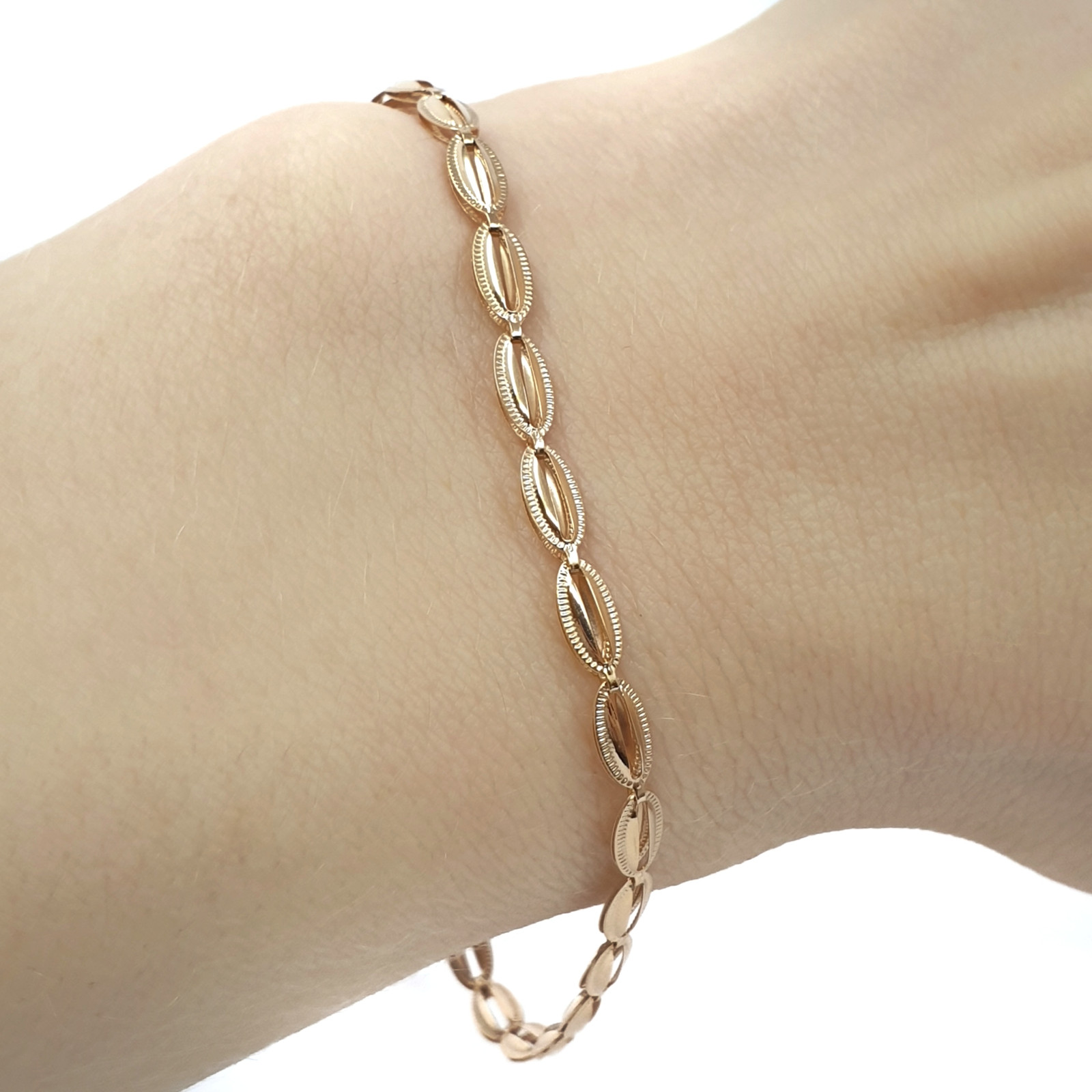 Rozā zelta aproce, kas piesaista uzmanību ar savu unikālo dizainu, kas sastāv no rūpīgi atveidotām kafijas pupiņu formas detaļām. Katras detaļas malas ir smalki iegravētas, piešķirot rotaslietai vēl vairāk tekstūras un izsmalcinātības. Šis ir elegants aksesuārs, kas piemērots gan ikdienas valkāšanai, gan īpašiem gadījumiem, piešķirot tēlam siltu rotaļīgumu un greznību.