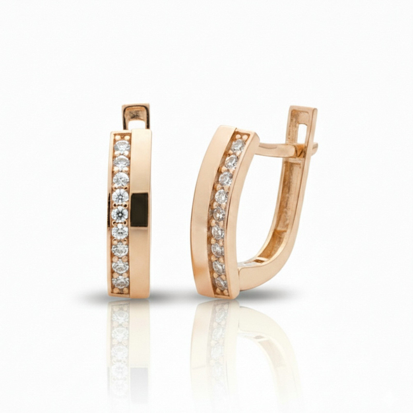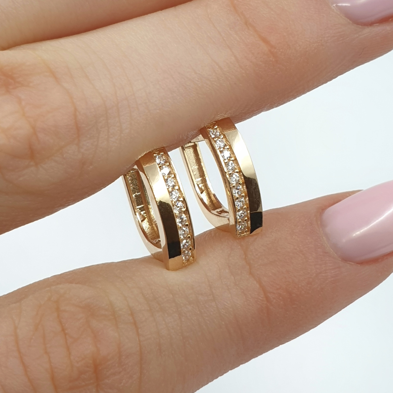 Zelta auskari, kas izgatavoti no sarkanā zelta, priecē ar savu smalko un vienlaikus grezno dizainu, ko rotā inkrustētas spīdīgas acis. Maigais zelta tonis un acu mirdzums piešķir auskariem elegantu izsmalcinātību. Ērtā, angļu tipa aizdare nodrošina ērtu un drošu nēsāšanu. Šī ir universāla izvēle gan ikdienas valkāšanai, gan īpašiem gadījumiem.