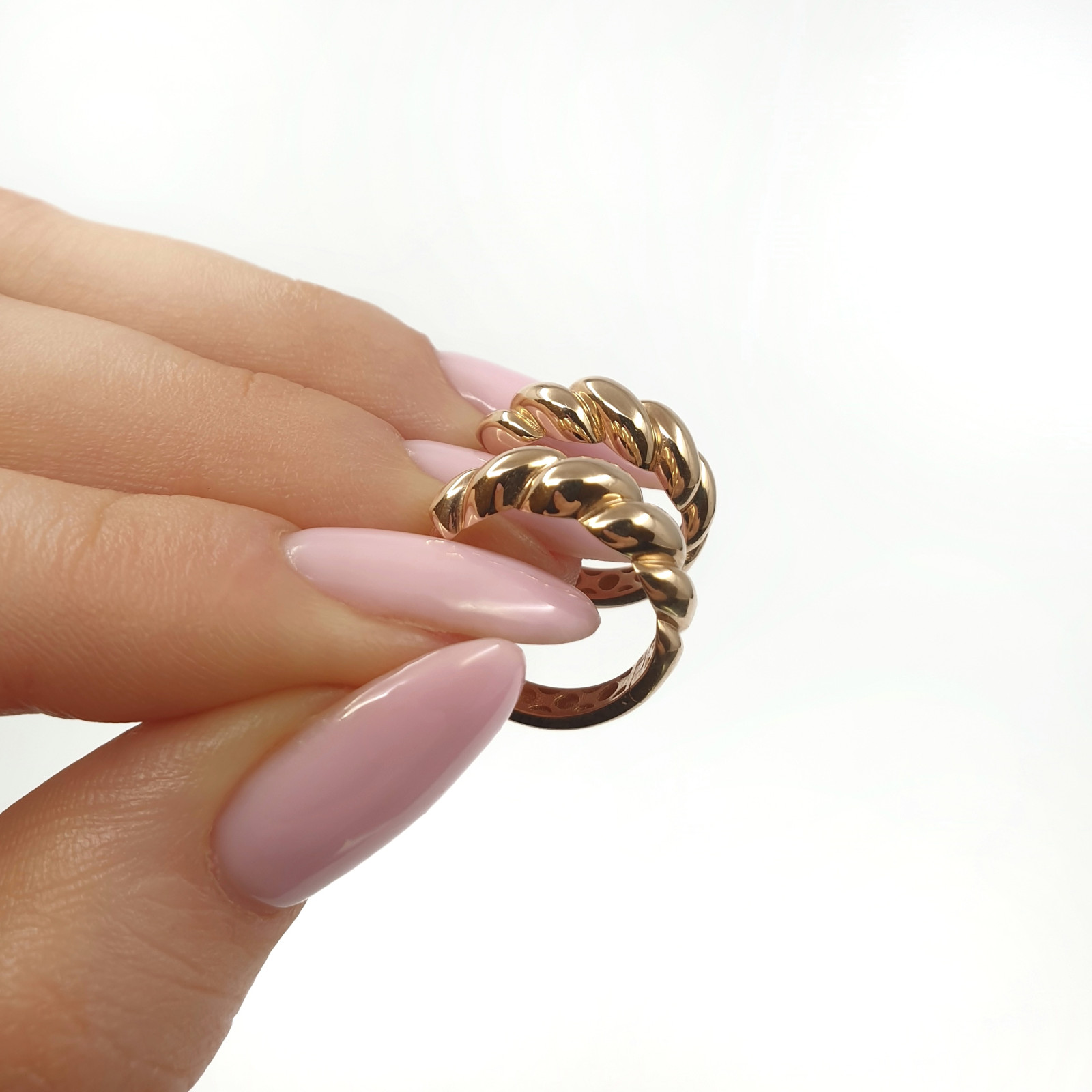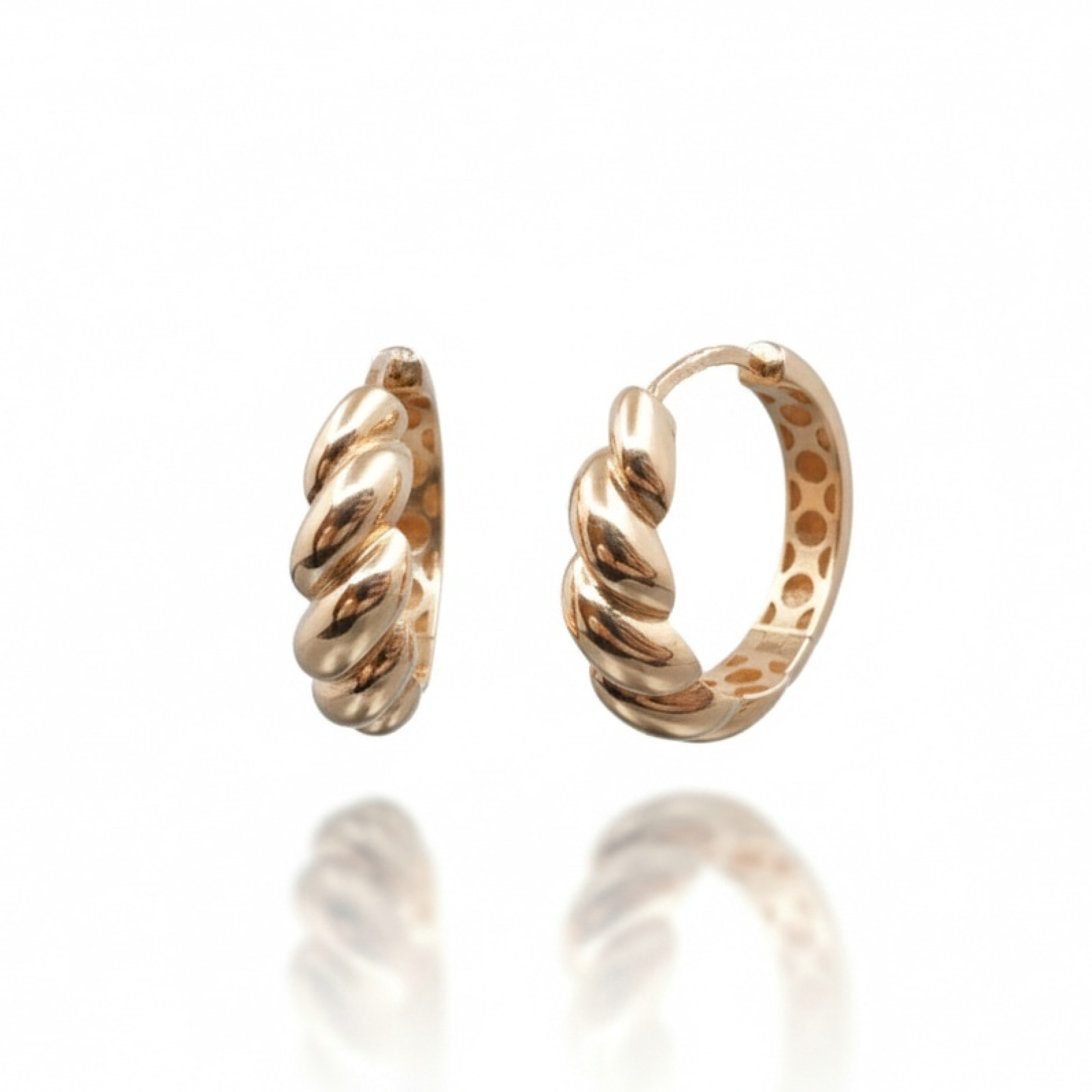 Zeltaini, apļa formas auskari, kas izgatavoti no rozā zelta, mirdz ar siltu un elegantu greznību. Tie ir dekorēti ar smalku, pītu virvi līdzīgu tekstūru, piešķirot tiem unikālu šarmu un modernu raksturu. Ērtā un ātrā aizdare ļauj auskarus viegli ievietot un nodrošina drošu nēsāšanu visas dienas garumā. Šī ir lieliska izvēle gan ikdienai, gan īpašiem gadījumiem.