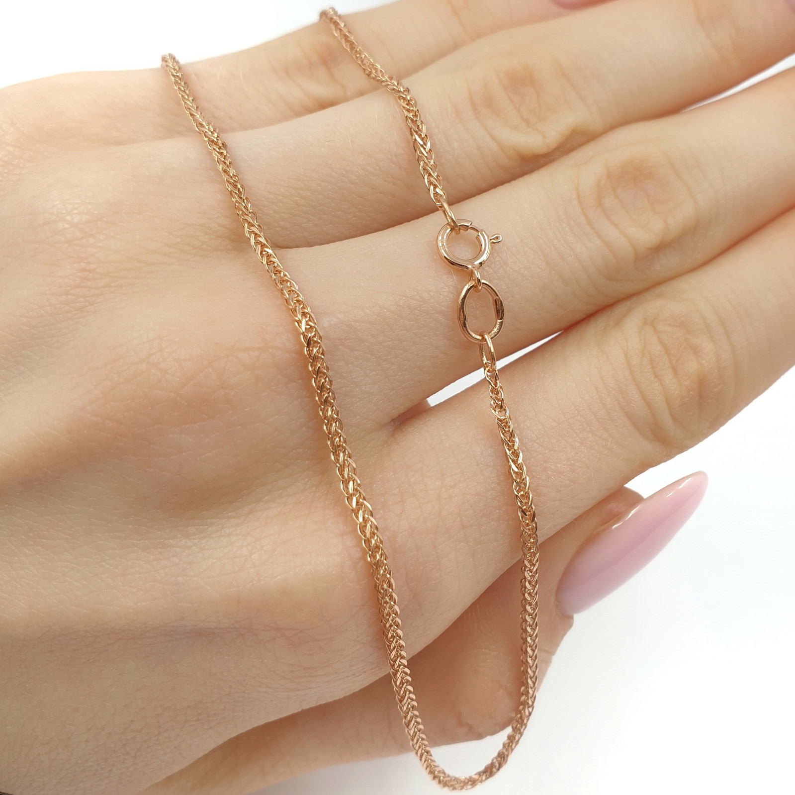 Zelta, rozā zelta ķēdīte izceļas ar skaistu, blīvu, elegantu pinumu, kas tai piešķir greznību un spīdumu. Gredzena aizdare ir uzticama un ērta, padarot ķēdīti viegli aiztaisāmu un drošu valkāšanu katru dienu. Šis klasiskā stila aksesuārs ir lieliski piemērots gan atsevišķi, gan kombinācijā ar jūsu iecienītākajiem kuloniem. Smalkais dizains ļaus jums viegli pieskaņot ķēdīti dažādiem tēliem.