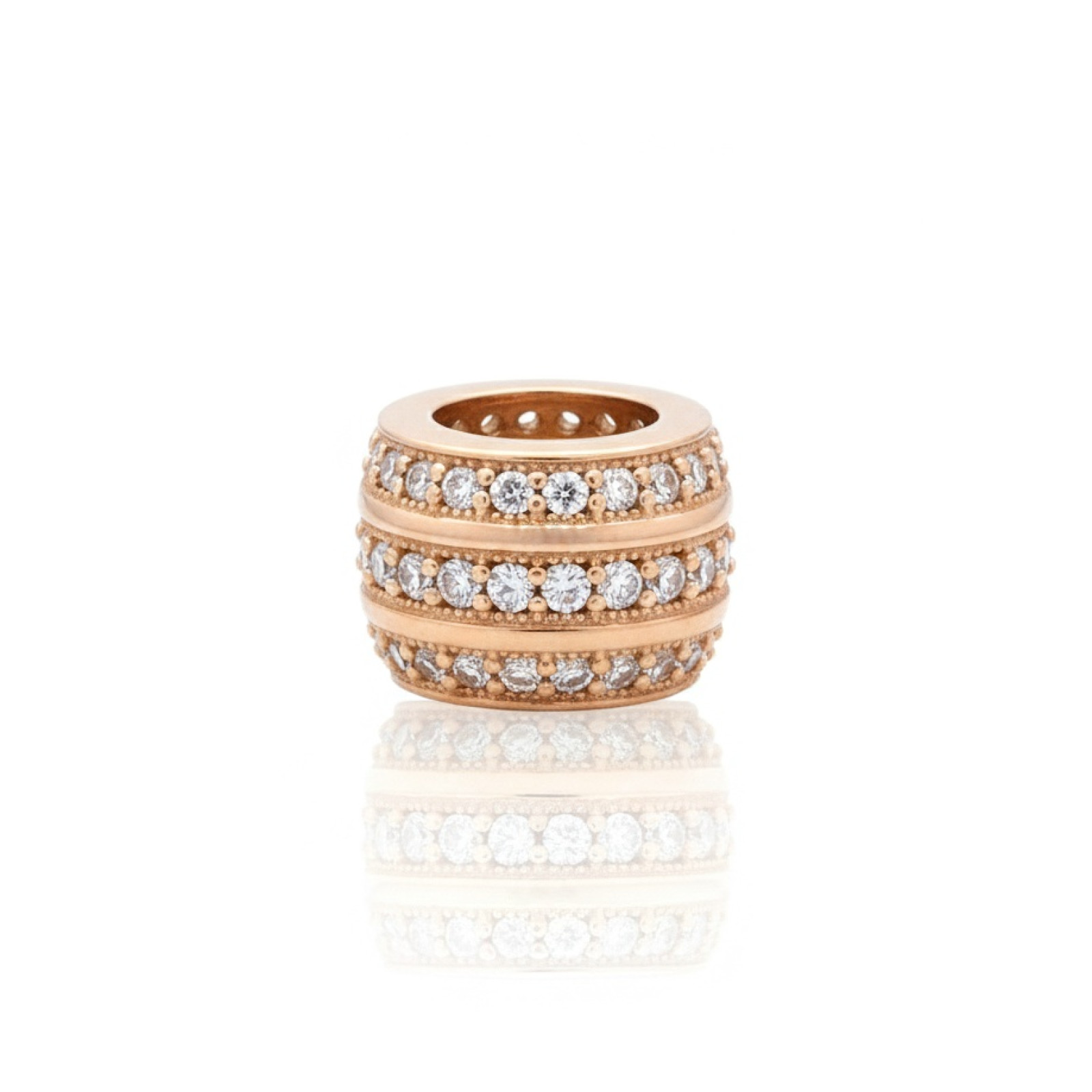 Rozā zelta kulons, kas piemērots Pandora rokassprādzei, izstaro greznību un izcilu mirdzumu. Apaļais dizains ir dekorēts ar blīvi inkrustētām acīm, piešķirot aksesuāram burvīgu mirdzumu no visām pusēm. Tas ir universāls, stilīgs akcents, kas viegli pieskaņojas dažādām rokassprādzēm un citiem kuloniem. Lieliska izvēle tiem, kas vēlas nemanāmi, bet spilgti atdzīvināt savu tēlu.