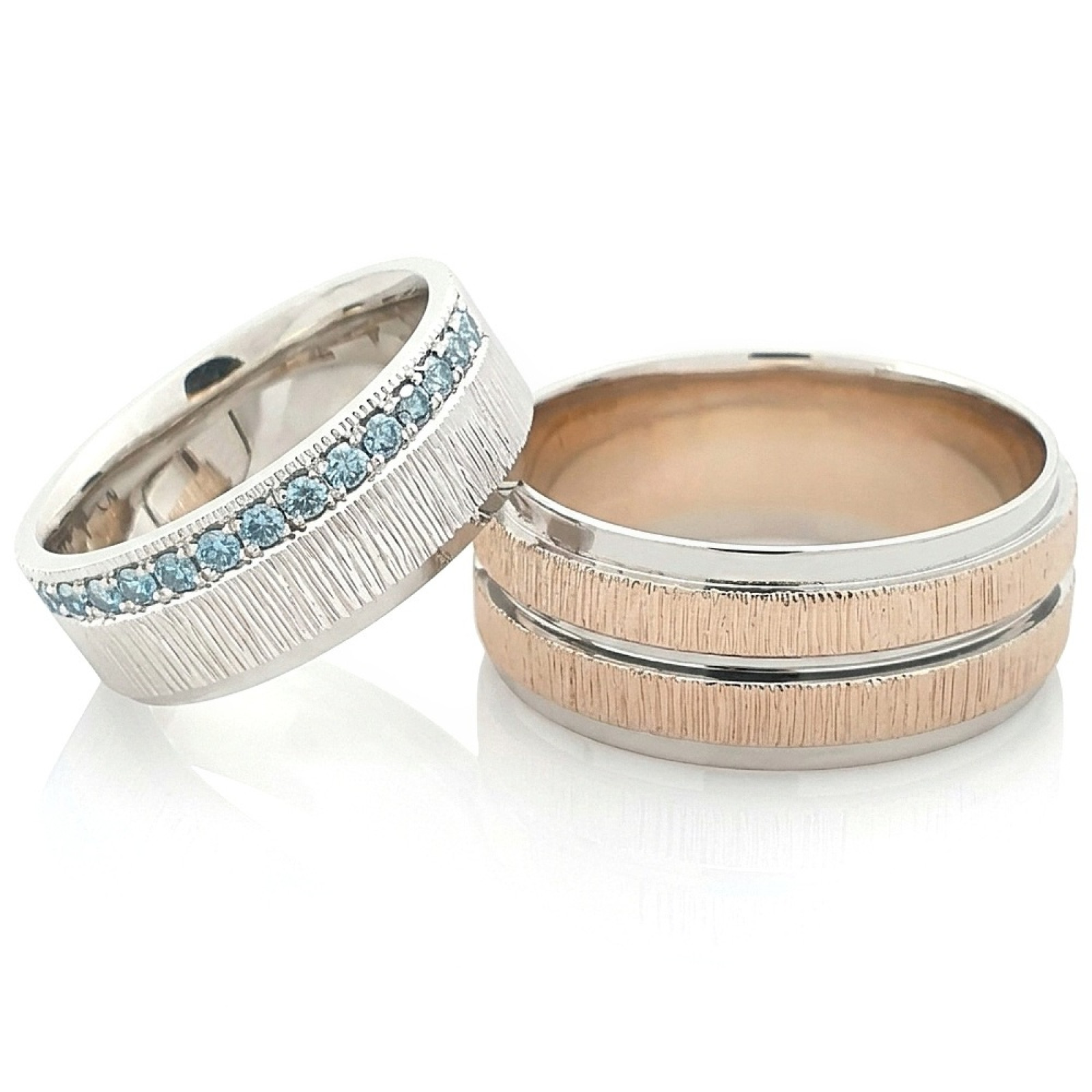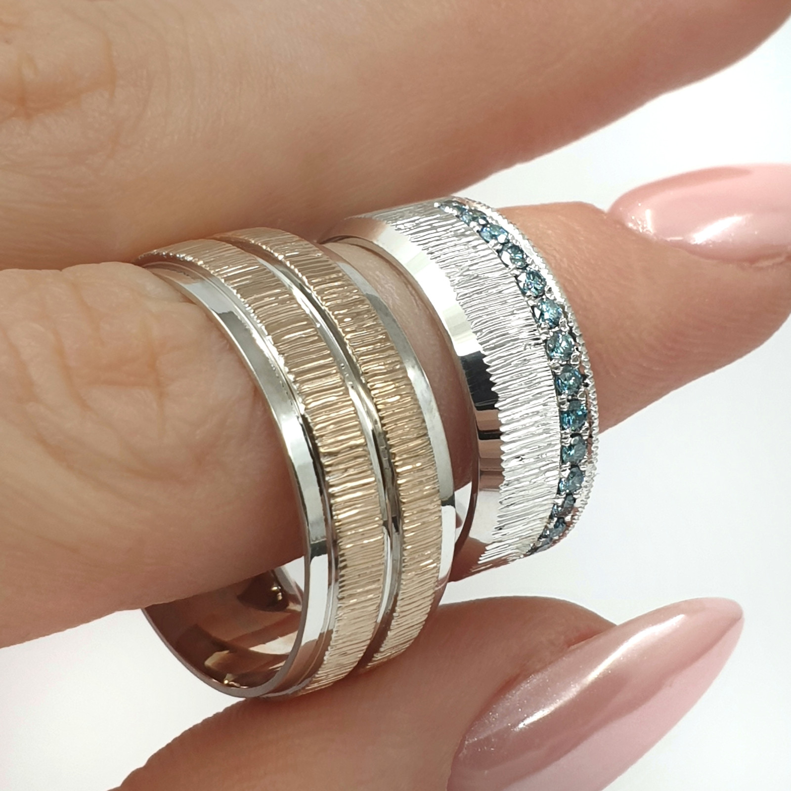 Išskirtiniai vestuviniai žiedai su mėlynais deimantais – elegantiškas pasirinkimas poroms, ieškančioms unikalumo ir subtilios prabangos. Šie žiedai išsiskiria moderniu dizainu bei ypatingu akcentu – mėlynais deimantais, kurie simbolizuoja ištikimybę, ramybę ir amžiną meilę.